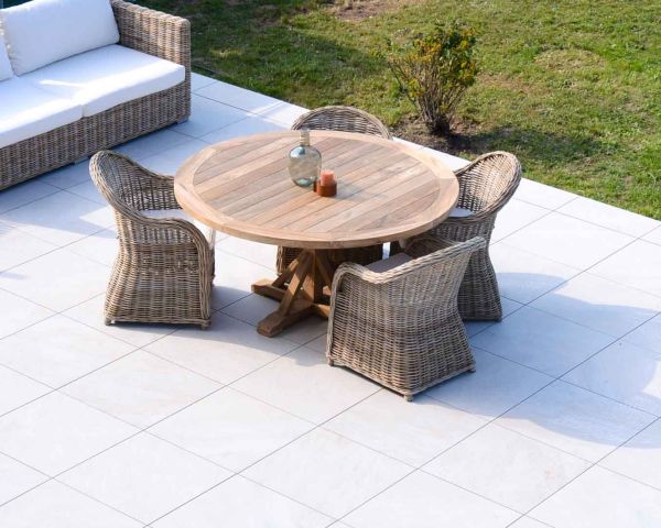 Il tavolo può ospitare da 4 a 6 persone. Il piano del tavolo, posto su una base a forma di croce, starà benissimo con le stoviglie verde chiaro e i tovaglioli di cotone bianchi. Con un diametro di 120 cm e un'altezza di 76 cm, il vostro nuovo mobile da giardino è ergonomico, pratico e caldo. Progettato in modo ecologico utilizzando teak riciclato, il vostro tavolo è un vero e proprio richiamo visivo! Il suo stile classico è comunque al passo con i tempi. Il ritorno alla semplicità e ai mobili realizzati con materiali naturali ci permette di ricaricare le batterie e di concentrarci sui valori essenziali. Basta con la superficialità! Godiamoci tutti le cose semplici e un buon pasto con gli amici. Seduti sulle vostre poltrone in rattan, i vostri cari potranno godersi una deliziosa serata in vostra compagnia...
