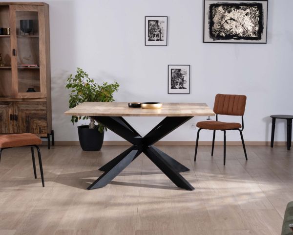Sostenuto da un'originale base in metallo nero a forma di croce, il tavolo da pranzo ha un design robusto che si integra naturalmente con un arredamento industriale o più contemporaneo.