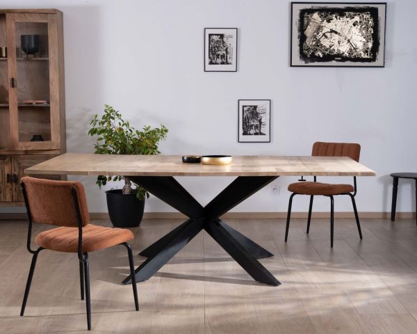 Sostenuto da un'originale base a croce in metallo nero, il tavolo da pranzo ha un design robusto che si integra naturalmente con un arredamento industriale o più contemporaneo.