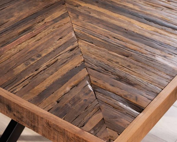 Per un look più industriale o riciclato, sedie in metallo o con schienali e sedute in legno di recupero che riprendono il piano di questo originale tavolo in acacia a spina di pesce creeranno un'atmosfera avvolgente in cui ogni elemento fonde la propria storia nel cuore della vostra.