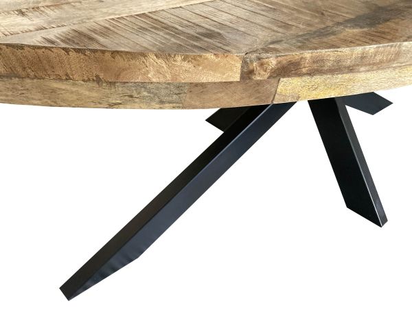 Il legno massiccio di mango, rinomato per la sua resistenza e durevolezza, ha un colore caldo e venature particolari che rendono ogni tavolo unico. La base in metallo nero, in stile mikado, garantisce una stabilità ottimale e accentua il suo aspetto grafico e industriale.