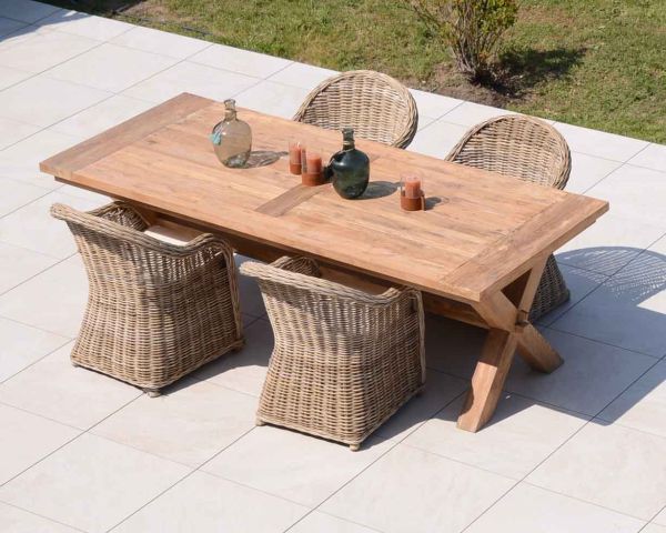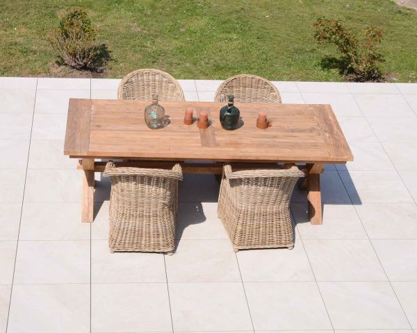 Con il passare del tempo e sotto l'azione dei raggi solari, il vostro tavolo in teak potrà assumere una tonalità grigiastra in modo del tutto naturale. Il vostro mobile rimarrà comunque superbo e pieno di fascino, portandovi in un viaggio in Indonesia, il suo paese d'origine. Realizzato a mano con la massima cura da falegnami locali, il vostro grande tavolo in legno preserva le risorse naturali utilizzando un materiale esotico riciclato. Se cercate un mobile robusto e duraturo, con questo tavolo da giardino rettangolare avete fatto la scelta giusta .
