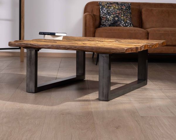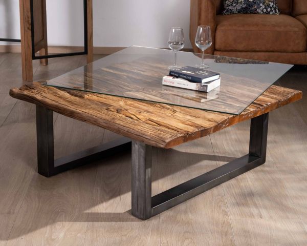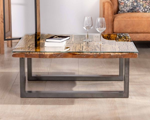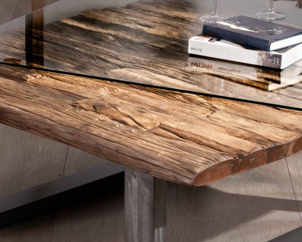 Il piano in vetro di questo tavolino offre una superficie liscia. Gioca con la luce e arricchisce visivamente lo spazio offrendo una prospettiva unica sulla bellezza naturale del legno sottostante. Il legno, lasciato grezzo e strutturato, mostra con orgoglio le sue asperità e i suoi motivi organici, ogni irregolarità amplificata ed evidenziata sotto il piano in vetro.