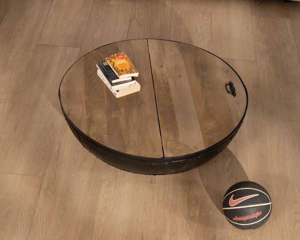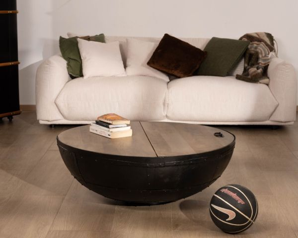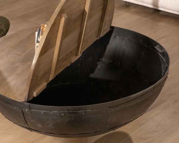 Una metà del piano del tavolo si apre, consentendo di utilizzare l'ampio volume interno per riporre tutto il necessario per i momenti di relax. Con il suo design unico e versatile, questo tavolino rotondo in legno di mango e metallo sarà un pezzo chiave nell'arredamento del vostro salotto, creando un'atmosfera unica.