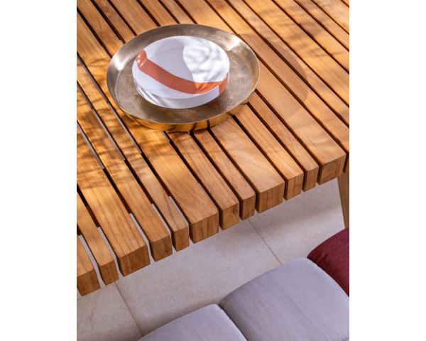 Il legno di teak è naturalmente impermeabile e imputrescibile. Nel corso delle stagioni e con l'esposizione al sole e alle intemperie, il teak può assumere tonalità grigie. Per preservare la lucentezza originale del teak e proteggerlo da eventuali tracce d'acqua, è possibile oliarlo di tanto in tanto con un prodotto adatto, una o due volte l'anno a seconda dell'uso.