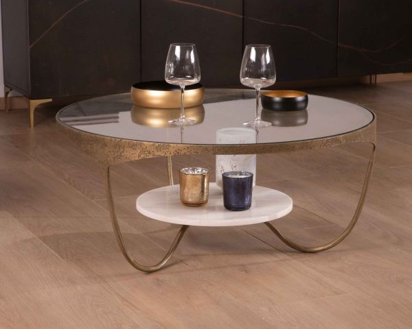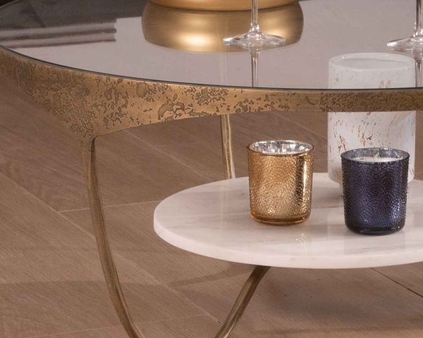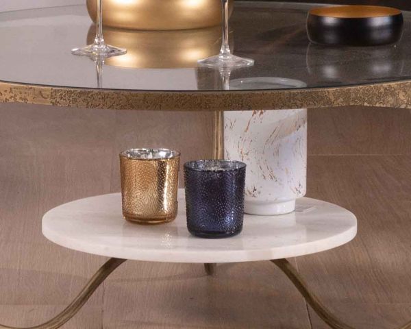 Il tavolino a due piani "Gilt Antique" sfrutta appieno la sua forma rotonda e slanciata per esaltare tutta la raffinatezza e l'eleganza del vostro salotto. Con il suo piano in vetro temperato, la parte inferiore in marmo bianco e la struttura in metallo lavorato, questo tavolino rotondo aggiungerà fascino e un tocco di modernità alla vostra area salotto. Con il suo stile glamour chic, questo tavolo di design è una gioia per gli occhi.