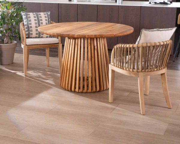 Quando arredate la vostra sala da pranzo, scegliete sedie in teak abbinate per esaltare l'armonia dei materiali. Non esitate a giocare con texture e colori complementari per migliorare l'atmosfera della stanza.