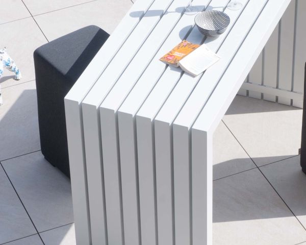 Decisamente trendy e originale, questo tavolo da bar affascina per il suo look grafico e originale. La sua struttura in alluminio bianco gli conferisce uno stile slanciato e al tempo stesso sobrio e distintivo, garantendone la resistenza agli agenti atmosferici e la leggerezza per l'uso all'aperto.