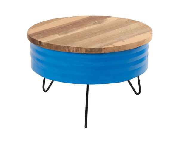 Un tavolo rotondo colorato e industriale dal sapore roots.