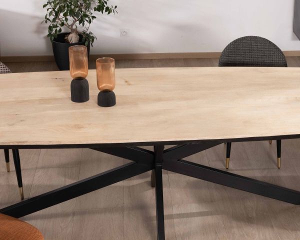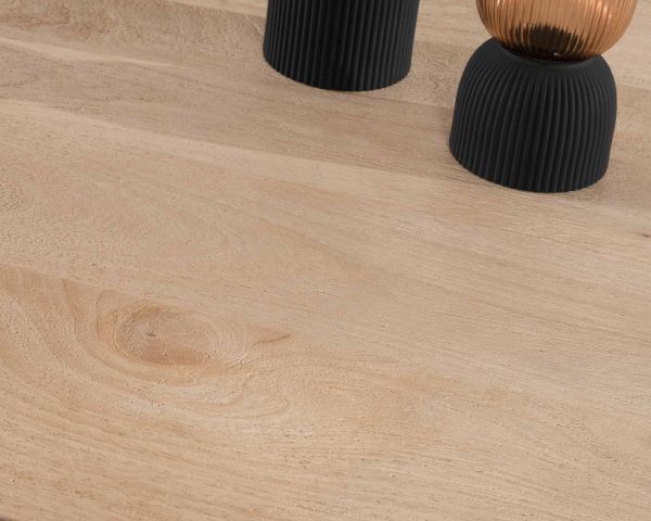 Il piano del tavolo a forma di barca è stato accuratamente lavorato per creare un look grafico in cui la natura è al primo posto. Il legno di mango massiccio ha una finitura leggermente sabbiata e la superficie liscia e piatta rivela le delicate striature delle venature, offrendo al contempo una sensazione di leggera consistenza. I bordi smussati verniciati in nero aggiungono un contrasto dinamico e rafforzano la personalità originale di questo tavolo da pranzo moderno.