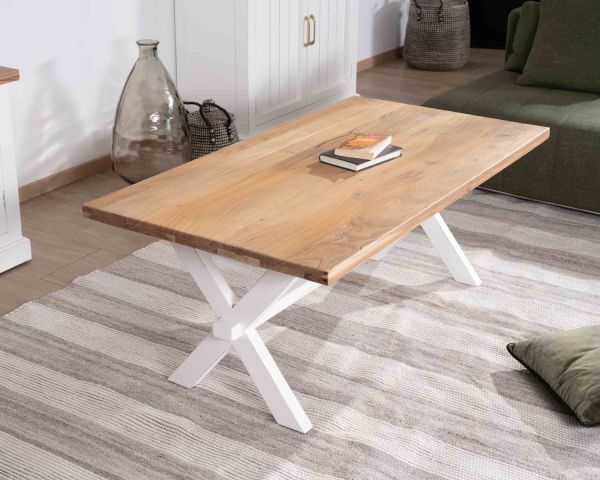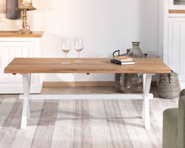 L'ampio piano rettangolare, lungo 135 cm e largo 70 cm, offre una superficie comoda e conviviale che si adatta perfettamente al centro del vostro salotto o come tavolo aggiuntivo in un grande soggiorno. Il piano di questo tavolino è stato lasciato al naturale con una finitura liscia e morbida al tatto e contrasta delicatamente con le gambe verniciate di bianco per creare un insieme armonioso e sereno. La base a X di questo tavolino combina la robustezza della sua costruzione con quella del legno massiccio per darvi un mobile dall'aspetto classico e rassicurante, ma anche stabile, solido e durevole.