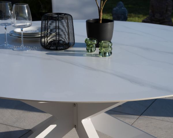 Adornato da un sontuoso piano in ceramica bianca con delicate venature grigie, questo tavolo offre una sottile raffinatezza che sedurrà lo sguardo e creerà un'elegante convivialità in giardino, in terrazza, in veranda o anche all'interno.