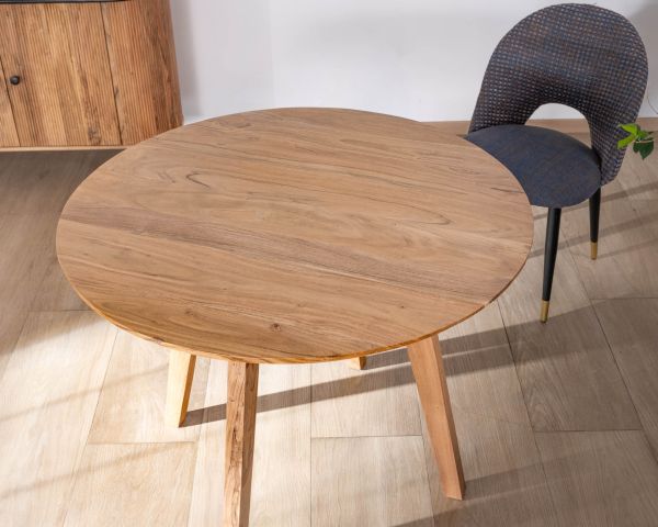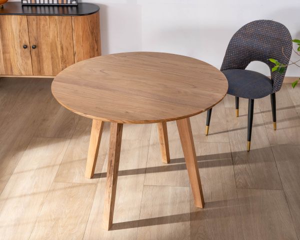Il suo piano circolare, di 100 cm di diametro, è un naturale invito alla condivisione, che trasforma ogni pasto in un momento di convivialità. Con la sua silhouette elegante e le sue linee equilibrate, questo tavolo da pranzo in legno massiccio si abbina perfettamente a sedie moderne in tessuto o a sedute vintage in pelle o rattan.