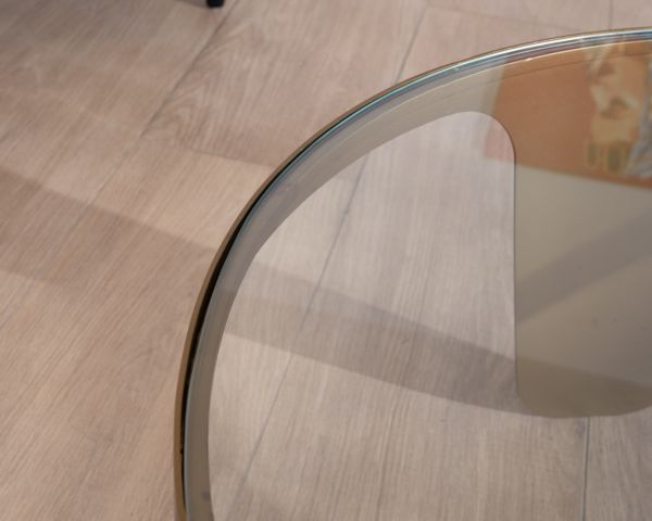 La sua struttura in ottone massiccio in tonalità dorata opaca è notevolmente robusta, mentre le 3 gambe originali garantiscono una stabilità rassicurante per l'uso quotidiano. Il piano in vetro, invece, è un materiale che offre leggerezza e luminosità all'insieme. Il gioco di materiali è sofisticato.