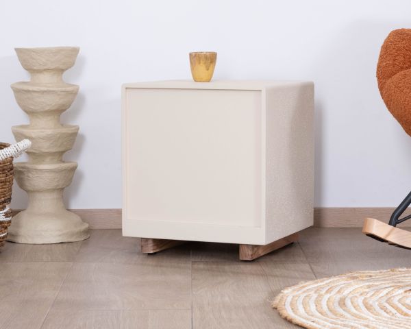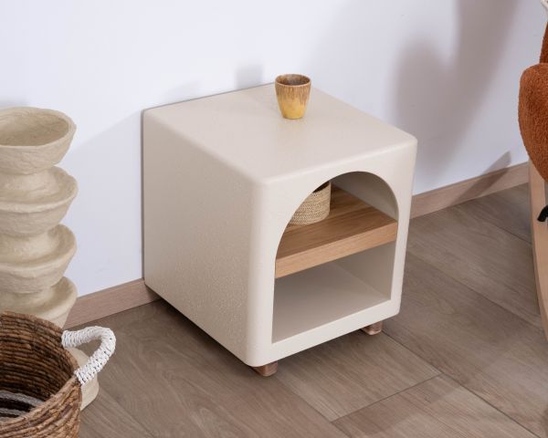 Struttura in MDF dalle linee morbide e pulite, con finitura in cemento sabbiato ed effetto pietra strutturata al tatto