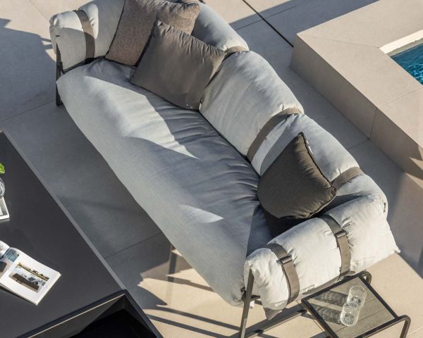 L'originalità di questo prodotto sta nella sua finitura. Laspessa seduta imbottita avvolge la struttura in alluminio grigio antracite, richiamando il concetto di borsa da notte e conferendo all'insieme un'aria vagabonda. Le cinghie utilizzate per fissare il cuscino alla struttura aggiungono un tocco bohémien, come se in un batter d'occhio si potesse arrotolare il bagaglio e partire all'avventura!