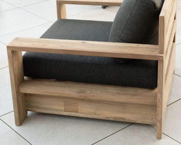 Materiali: Teak riciclato, imbottitura in schiuma e fibra, tessuto speciale per esterni