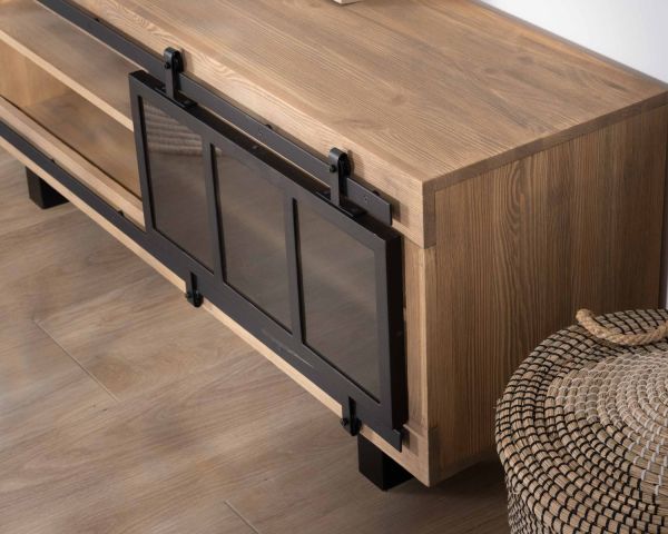 Materiali: Pino massiccio spazzolato, metallo, vetro fumé, MDF laccato nero