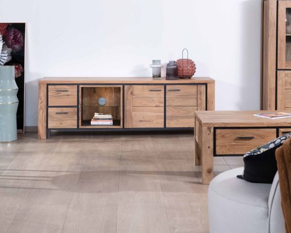 La robustezza dell'acacia massiccia conferisce a questo mobile TV contemporaneo una lunga durata. Abbinato a un arredamento punteggiato di tocchi colorati che risveglieranno sottilmente l'atmosfera, questo mobile, come il resto di questa collezione, contribuirà a rendere il vostro salotto un luogo armonioso, caldo e accogliente.